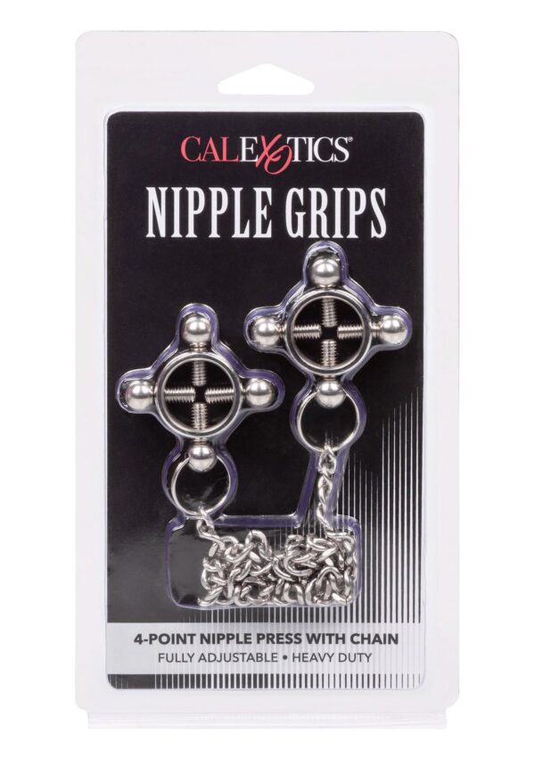 Push sensation to the next level and enjoy teasing nipple play with the Nipple Grips 4-Point Nipple Press with Chain. Explore elevated sensation with the 2 fully adjustable multi use clamps, screw down 4-point press, and teasing chain. Reach new levels of playful pleasure in the screw-down 4-point press with fully adjustable screws. Clamp the naughty clasps to the nipple or anywhere on the body and enjoy every rush of pain and pleasure.