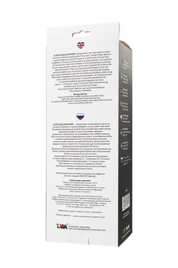 Wykonana z wysokiej jakości materiałów, pompa A-Toys zapewnia bezpieczne, skuteczne i komfortowe użytkowanie. Wyposażona w mocny mechanizm pompujący, jest niezawodnym narzędziem dla tych, którzy dążą do nowych zwycięstw w swoim życiu intymnym.