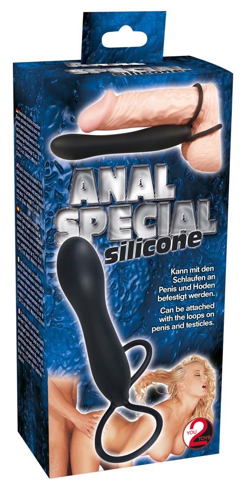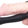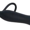 Czarne analdo dildo z dwoma pętlami do jednoczesnego mocowania do penisa i jąder. Długość całkowita ok. 15 cm, średnica ok. 1,9 do 2,5 cm. Czarny. Materiał: silikon.