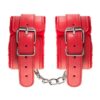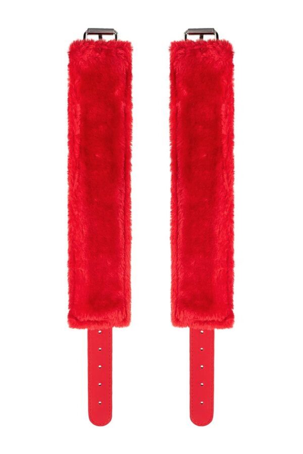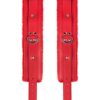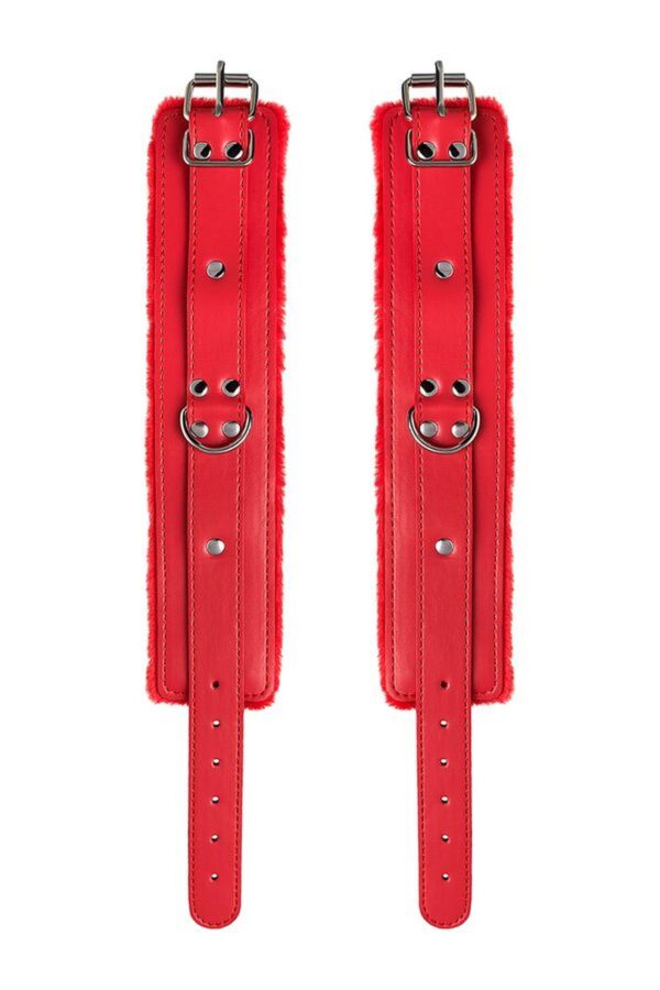 Zastosowano niklowane okucia, które są trwałe i stylowe. Kajdanki połączone są krótkim paskiem z dwoma karabińczykami, co umożliwia szybkie i stabilne zapięcie.