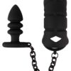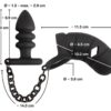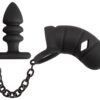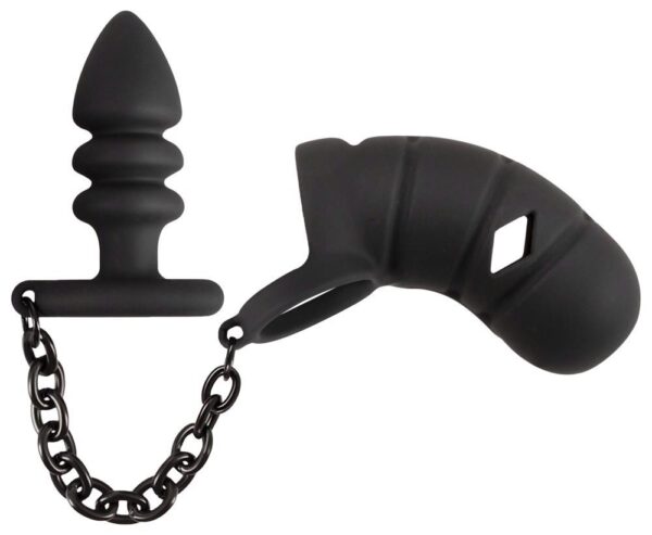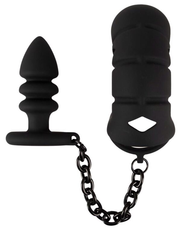 The Cock cage with butt plug by Black Velvets combines a cock cage with a ball ring which is connected through a sturdy chain with a grooved anal plug. In addition to the great feel, the cock cage provides an arousing look and makes a thrilling accessory for control and chastity play.