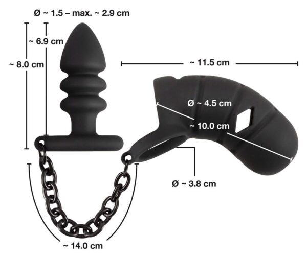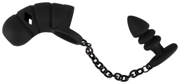 The penis is inserted into the flexible and anatomically formed silicone cage and the elastic rings are pulled over the testicles, securing everything in place. The anal plug is inserted into the anus. The connection chain provides an exciting pull and stimulates the perineum.