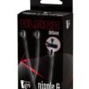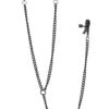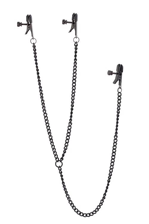 Zestaw czarnych metalowych zacisków na sutki, każdy na metalowym łańcuszku o długości 20 cm, oraz przymocowany zacisk łechtaczki na metalowym łańcuszku o długości 32 cm.