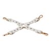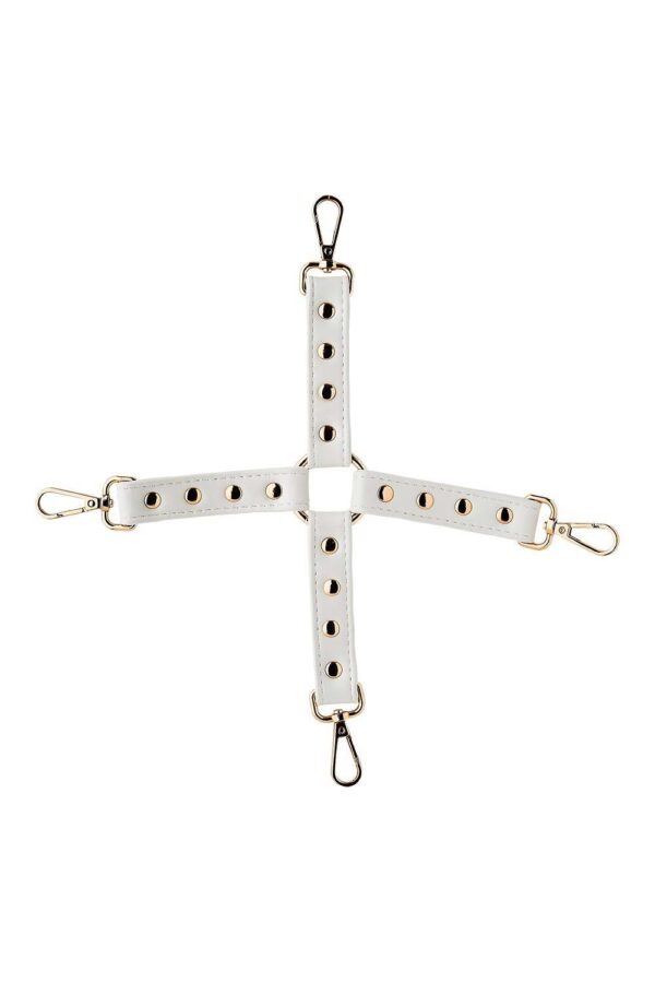This hog tie from the Blaze Elite collection is made of white artificial leather with gold coloured metal details that makes it look very stylish. Enhance your bondage game with a hog tie to fasten the arms and legs of your sub. The 4 musketon hooks can be used to attach chains, ropes, handcuffs, ankle cuffs and other bondage accessories, for example the matching wrist and ankle cuffs from the Blaze Elite collection. Hog tieMade of white artificial leatherWith gold coloured metal details, nickle freeWith 4 clasp hooks