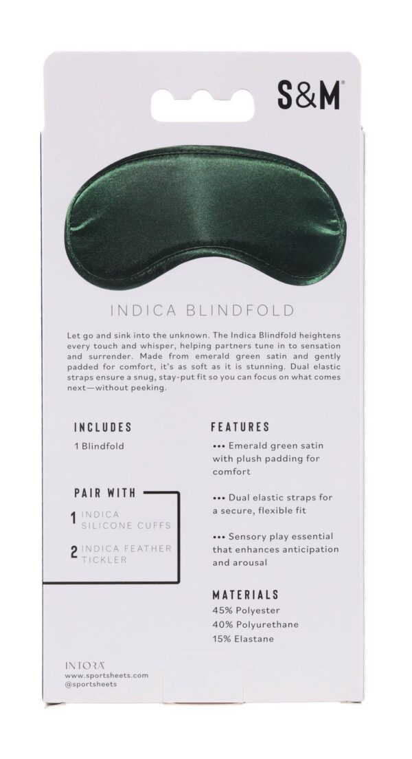Let go and sink into the unknown. The Indica Blindfold heightens every touch and whisper, helping partners tune in to sensation and surrender. Made from emerald green satin and gently padded for comfort, it’s as soft as it is stunning. Dual elastic straps ensure a snug, stay-put fit so you can focus on what comes next — without peeking.Emerald green satin with plush padding for comfortDual elastic straps for a secure, flexible fitSensory play essential that enhances anticipation and arousalMaterials: 65% Polyester, 20% Polyurethane Foam, 15% ElastanePackaging details: BoxAbout IndicaEmerald + Gold Aesthetic: Lush faux leather, shimmering hardware, delicate feathers, and crystal detailsInclusive & Accessible: All-gender, beginner-friendly, approachable BDSM designs