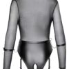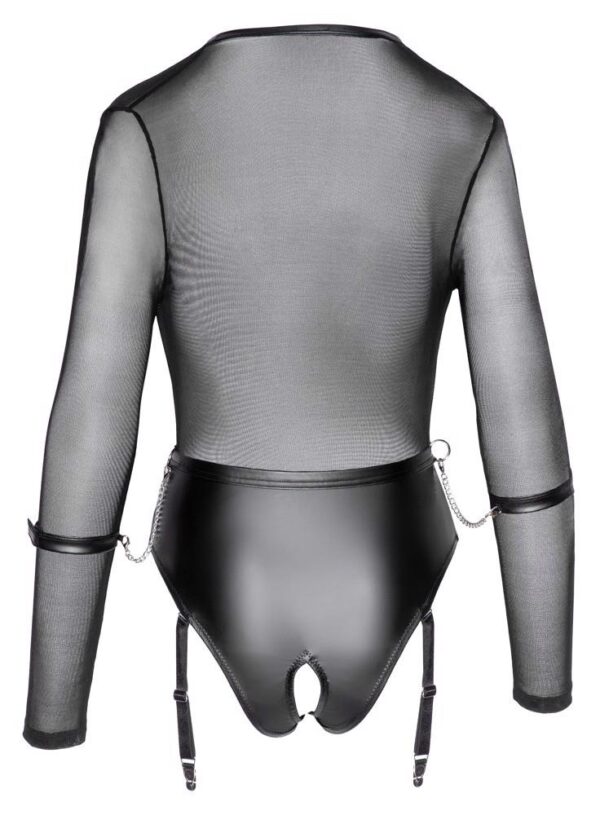 Wyjątkowo nisko wycięte body Cottelli BONDAGE z przezroczystym, powernetowym topem z długim rękawem i całkowicie pozbawioną krocza częścią majteczkową w modnym matowym stylu – idealny spontaniczny sex strój! Solidnie uszyty pas z 2 pierścieniami z przodu i po jednym pierścieniu z każdej strony do zapinania dołączonych kajdanek z łańcuszkami karabińczykowymi. Kajdanki z regulowanymi zapięciami na rzepy. Regulowane szelki są odpinane.