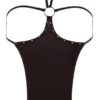 Seksowny jednoczęściowy garnitur z uchwytem na szyję do wiązania i ozdabiania dżetów na otwartych miseczkach i otwartym kroczu. Z tyłu tylko stringi. Czarny. 85% poliamid, 15% spandex.