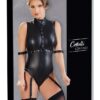 Amortyzator w czarnym, elastycznym, matowym kolorze z metalowymi akcesoriami. Na piersi suwaki, przód ozdobiony ćwiekami. W każdym przypadku boczna pętla na ramię z zapięciem na rzep. Suwak z tyłu. Dwukierunkowy zamek błyskawiczny przechodzi przez krocze. Pas biodrowy regulowany i zdejmowany. 90% poliestru, 10% spandexu. Bez pończoch.