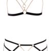 Miękki biustonosz bez biustu i figi bez krocza marki Cottelli LINGERIE wykonane z elastycznych aksamitnych tasiemek i łańcuszków z kółeczkami w kolorze różowego złota. Majteczki od spodu w całości wykonane z elastycznej koronki. Biustonosz zapinany z tyłu na haftki, ramiączka regulowane dla idealnego dopasowania. Łańcuszki są częściowo wyjmowane z biustonosza i całkowicie wyjmowane z majtek dzięki karabińczykom. Regulowane paski na udach są również odpinane od majtek.
