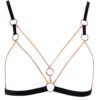 Miękki biustonosz bez biustu i figi bez krocza marki Cottelli LINGERIE wykonane z elastycznych aksamitnych tasiemek i łańcuszków z kółeczkami w kolorze różowego złota. Majteczki od spodu w całości wykonane z elastycznej koronki. Biustonosz zapinany z tyłu na haftki, ramiączka regulowane dla idealnego dopasowania. Łańcuszki są częściowo wyjmowane z biustonosza i całkowicie wyjmowane z majtek dzięki karabińczykom. Regulowane paski na udach są również odpinane od majtek.