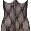 Kombinezon bezopiersiowy wykonany z koronki z efektem przytulania z halterem na szyi, który można otworzyć za pomocą rzepu. Bez tyłka i kusząco otwarty na krocze. Ze stopą. Czarny. 100% poliamid.