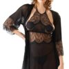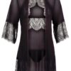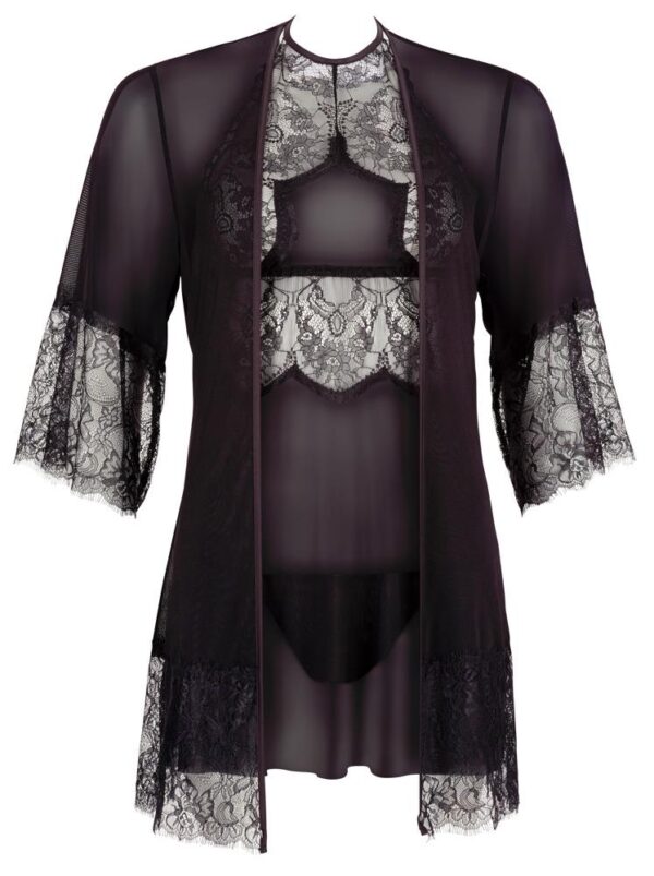 The matching black kimono with elbow length sleeves and a satin belt covers your curves in a sexy way until you are ready to reveal what’s underneath. The kimono also stands out because of its transparent material, which makes it a real eye-catcher – even the bottom of the sleeves are made out of this sensual eyelash lace and provides that wow effect.