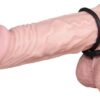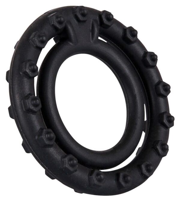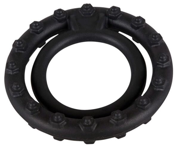 Penis jest szczelnie zamknięty przez pierścień nubbing penisa, podczas gdy drugi pierścień szczelnie obejmuje jądra. Pierścienie rozciągliwe są połączone z prętem stymulacyjnym. Pierścień średnica 2,4 i 3,7 cm. Czarny. Materiał: silikon.