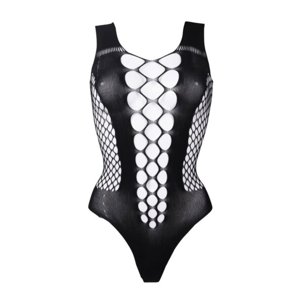 Zmysłowe body typu teddy, które łączy w sobie kryjący materiał z uwodzicielną siateczką.