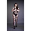 Zmysłowy bodystocking z koronkowym wzorem, wysokim dekoltem i seksownym wycięciem typu keyhole z krzyżującymi się paskami.