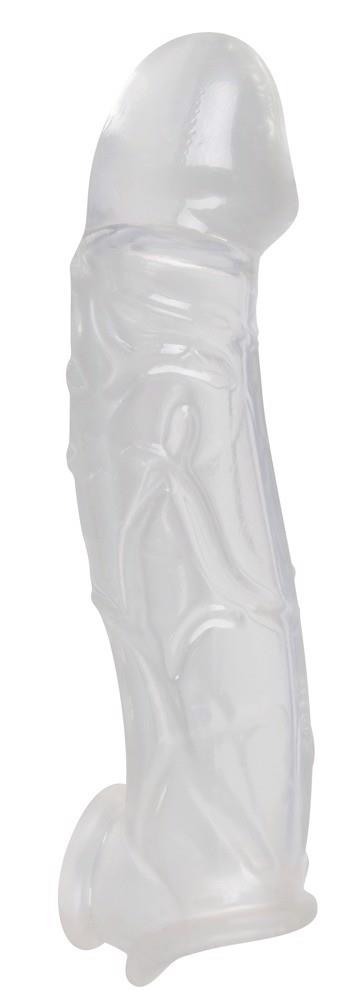 Ten przezroczysty rękaw na penisa z przedłużeniem i pierścieniem kulkowym marki Crystal Clear pogrubia penisa dzięki grubości materiału i wyraźnym żyłkom oraz wydłuża go o 5 cm dzięki masywnej żołędzi.