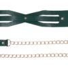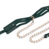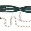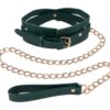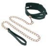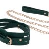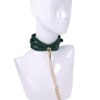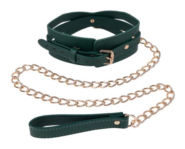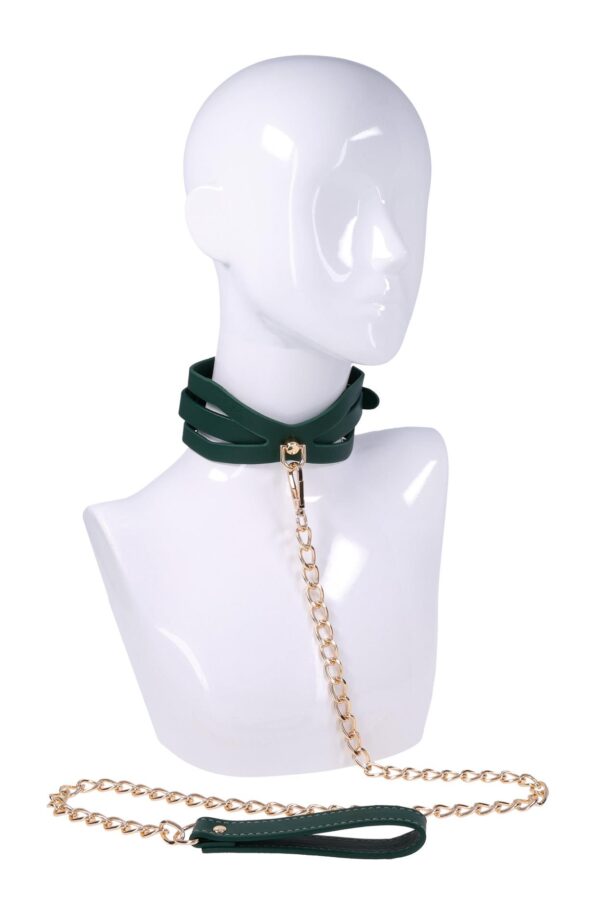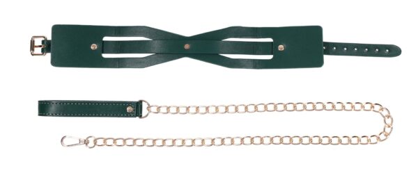 Surrender in style. The Indica Cutout Collar wraps the neck in rich emerald green with luxe gold hardware and sensual cutout accents that expose just enough skin. Lined for comfort, this collar is a soft but striking symbol of submission. An invitation to give in and give over. The coordinating gold chain leash with green handle lets your dominant guide the pace, whether you’re at home or on display. Pair with the Indica Cutout Cuffs for a beautifully bound look.Emerald green collar with seductive cutout detailingIncludes gold chain leash with matching green faux leather handleSoft lining and adjustable fit for secure, comfortable wearAdjustable buckle closure fits necks 13.5 to18.5 inch / 34,3 to 47 cmChain leash 36 inch / 91 cm in lengthMaterials: 70% Polyurethane, 25% Iron, 5% Zinc AlloyPackaging details: Hang CardAbout IndicaEmerald + Gold Aesthetic: Lush faux leather, shimmering hardware, delicate feathers, and crystal detailsInclusive & Accessible: All-gender, beginner-friendly, approachable BDSM designs