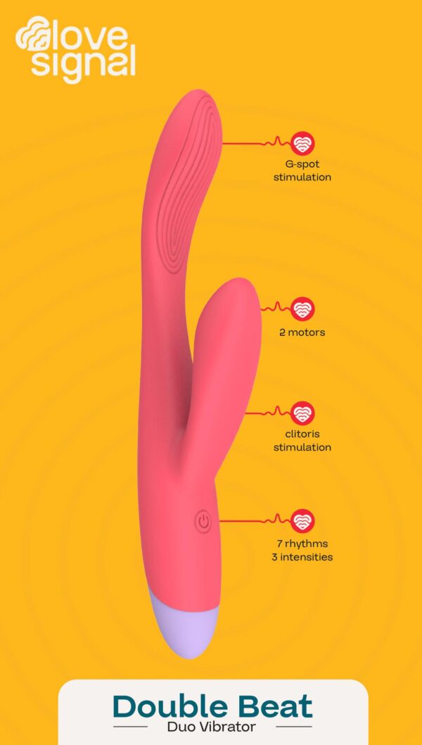 Double Beat Duo Vibrator z kolekcji Love Signal marki Dreamtoys zapewnia zsynchronizowaną stymulację wewnętrzną i zewnętrzną, oferując wszechstronną oraz ekscytującą przyjemność.
