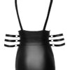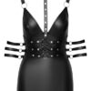 Elastyczna krótka sukienka Cottelli BONDAGE o obcisłym kroju i szlachetnym czarnym matowym wyglądzie z metalowymi elementami w kolorze srebrnym. Nisko wycięta z przodu, ekscytująco bez pleców. Dołączone 4 paski na kostki mogą być przeciągnięte przez boczne pierścienie bondage na 3-drożnym pasie. Dzięki regulowanym zapięciom na rzepy, ramiączka są szybko zakładane w celu zaspokojenia pożądania. Do pasa przymocowana jest również taśma piersiowa, która prowadzi do kołnierza z zapięciem na zatrzask. Pasek, pasek piersiowy i szelki są regulowane dla idealnego dopasowania – pasek i kołnierz są całkowicie zdejmowalne.