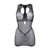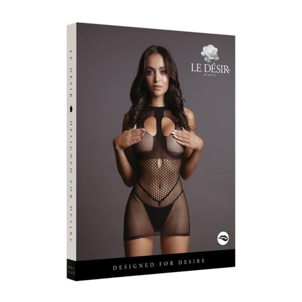 Zmysłowa mini sukienka z wysokim dekoltem, wykonana z połączenia siateczki i wzoru fence net.