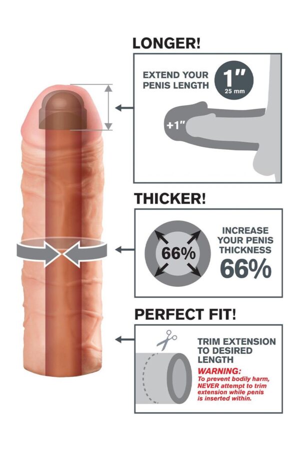Mega 1″ Extension to przedłużacz, który można łatwo dostosować poprzez przycięcie u podstawy, by idealnie pasował. Jest bardzo rozciągliwy, dzięki czemu dopasowuje się do większości rozmiarów, a jednocześnie na tyle ciasny, by pomóc Ci wytrwać dłużej. Twoja partnerka doceni głębszą penetrację dzięki 1-calowemu przedłużeniu na końcówce, podczas gdy niezwykle realistyczny trzon sprawia, że jesteś o 66% grubszy na całej długości. Miękki materiał Fanta Flesh® przypomina drugą skórę, zapewniając Ci długość, obwód i pewność siebie niezbędną do zaspokojenia Twojej ukochanej.