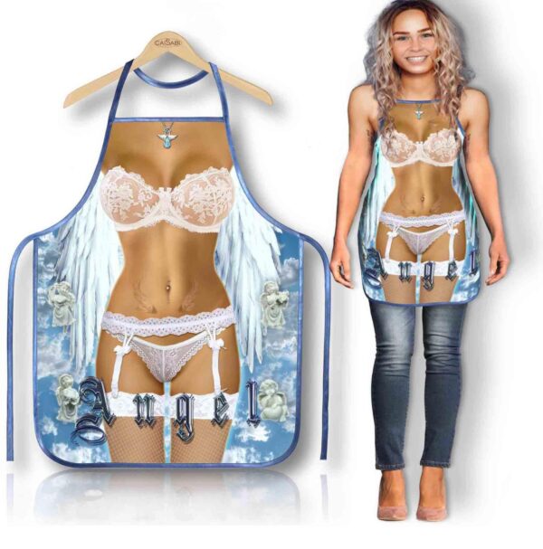 Seksowny fartuszek Angel to zabawny i zmysłowy gadżet, który idealnie sprawdzi się jako prezent dla osób z poczuciem humoru. Fartuszek przedstawia ciało anielskiej piękności w białej koronkowej bieliźnie z delikatnymi skrzydłami — połączenie niewinności i kuszącego wdzięku. Wykonany z trwałego, łatwego w czyszczeniu materiału, doskonały do użytku w kuchni, na imprezach lub wieczorach panieńskich. Z regulowanym paskiem na szyję i praktycznymi troczkami, zapewnia komfort i dopasowanie dla każdego. Doskonały pomysł na prezent dla osób, które lubią łączyć gotowanie z dobrą zabawą!