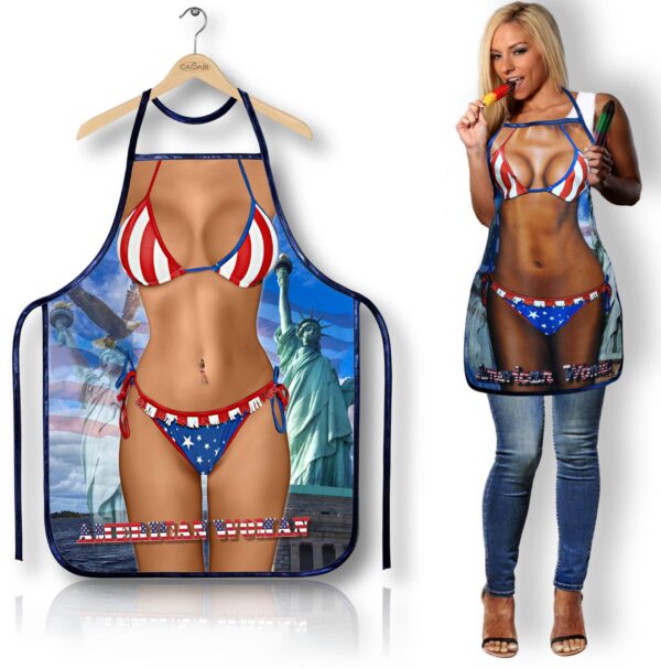 Rozpal kuchnię w prawdziwie amerykańskim stylu! Fartuch American Woman to połączenie gorącego humoru, śmiałości i odrobiny patriotycznego uroku rodem z USA. Realistyczny nadruk sylwetki w bikini inspirowanym flagą Stanów Zjednoczonych, w tle Statua Wolności i orzeł w locie — wszystko to tworzy efekt, który przyciąga wzrok szybciej niż fajerwerki 4th of July.