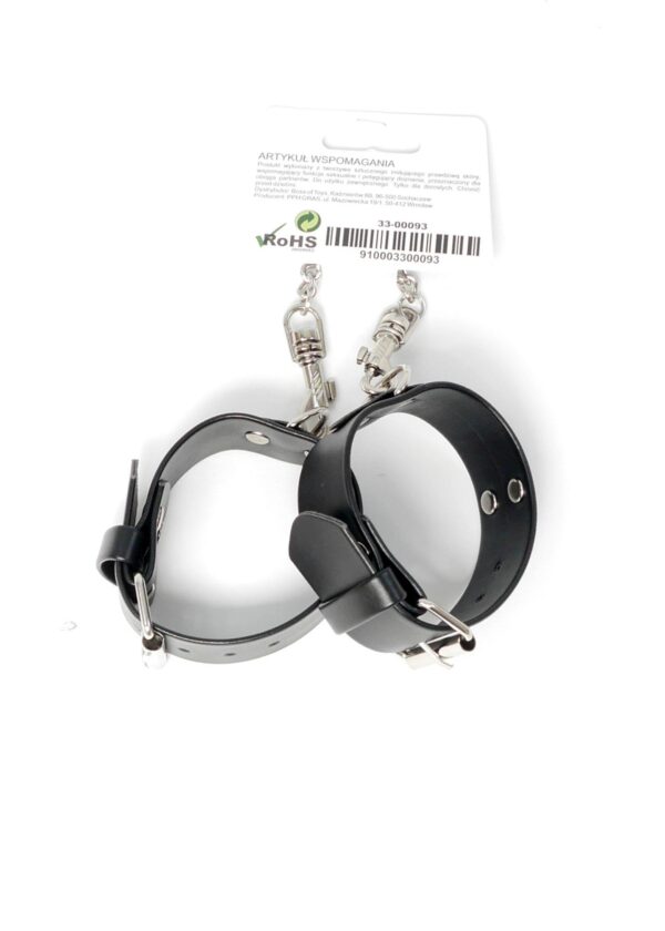 Zwiąż ręce swojego podwładnego lub przywiąż je do łóżka, aby uzyskać ekscytujące doświadczenie niewoli! Mankiety można regulować w zakresie 18 – 22 cm, dzięki czemu zawsze idealnie pasują. Mankiety są przymocowane do siebie metalowym łańcuchem, ale klipsy umożliwiają również ich oddzielenie i używanie w połączeniu z innymi zabawkami. Długość łańcuszka: 5 cm + karabińczyki (razem 10 cm). Mankiety wykonane są ze sztucznej skóry, miękkie w dotyku, dzięki czemu są wygodne w noszeniu. Szerokość mankietów: 3 cm.