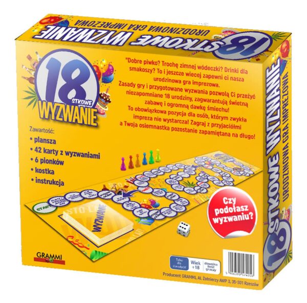 Zawiera plansze do gry, 42 karty z wyzwaniami, instrukcję, 6 pionków i kostkę. To wszystko w stylowym pudełku, idealna zarówno dla siebie jak i na prezent osiemnastkowy.