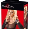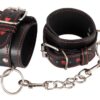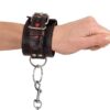 Czarne kajdanki Bad Kitty o wyglądzie skóry z przeszyciami i małymi, dziurkowanymi serduszkami w sygnalnym kolorze czerwonym. Dzięki praktycznemu zapięciu na klamrę i odpinanemu 15 cm łańcuszkowi łączącemu (z karabińczykami), ten ekstrawagancki mankiet jest idealny również dla bardzo wąskich nadgarstków – obwód można regulować w zakresie 17-27 cm.