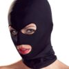 Czarna, szczelnie przylegająca do głowy maska wykonana z elastycznego materiału. Oczy i usta są wolne. 92% poliester, 8% spandex.