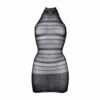 Zmysłowa mini sukienka z wysokim dekoltem, ozdobiona koronkową lamówką i eleganckim wzorem w paski.