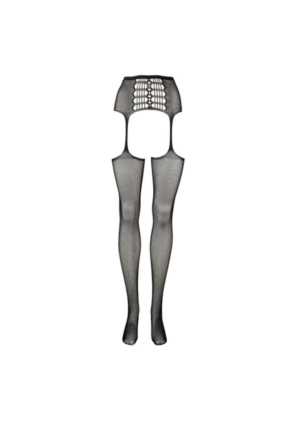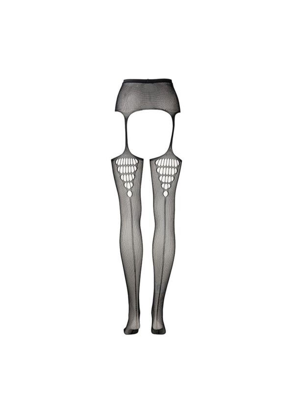 Pończochy z pasem do pończoch w stylu high-waist, z szarpanymi detalami w talii, które rozciągają się również na plecach nóg. Pończochy mają wyraźne szwy z tyłu. Styl pasuje na rozmiar S-XL. Stringi nie są dołączone do zestawu.