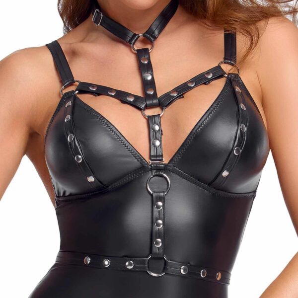 Dekoracyjny pasek typu harness z pierścieniami, ćwiekami i zatrzaskami podkreśla szyję, dekolt i talię, nadając stylizacji zmysłowego, odważnego charakteru. Paski można regulować w kilku miejscach, a cały harness można w razie potrzeby całkowicie odpiąć.