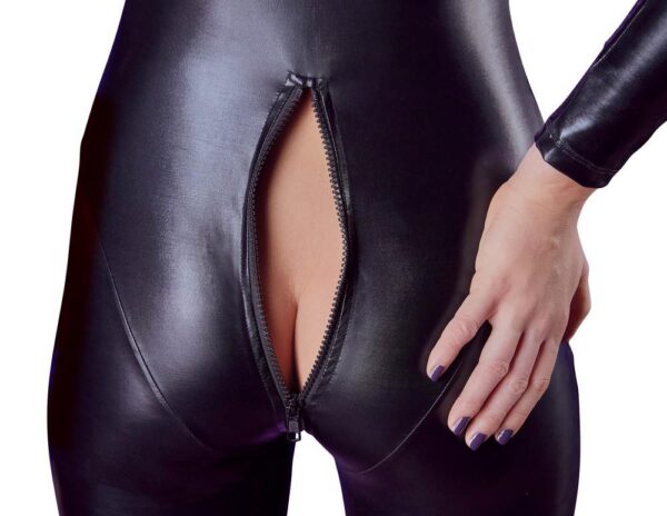 Szlachetny błyszczący kombinezon z małym stojącym kołnierzem i przednim 2-warstowym suwakiem do dołu. Przyjemnie elastyczne i pewne dopasowanie.