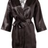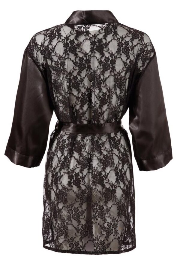 Krótkie kimono z rękawami, małą wiązaną kokardką z przodu i odpinanym wiązanym paskiem w talii. Wykonane z jedwabistej satyny. Z tyłu w całości wykonana z półprzezroczystej koronki o kwiatowym motywie.