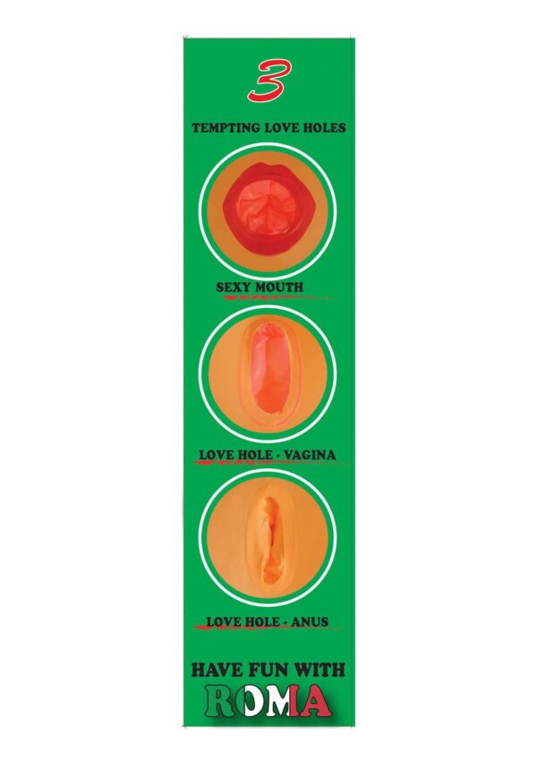 Roma – lalka miłości. Piękna nadmuchiwana lalka miłości z czarującą nadrukowaną twarzą i stojącą pozycją, która kusi i wzbudza sensację. Jest ona naturalnych rozmiarów, posiada piersi i 3 kuszące dziurki miłosne, w których można umieścić penisa.