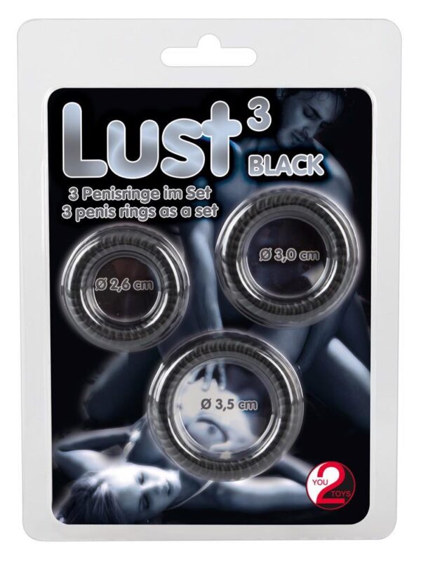 3 pierścienie penisa o strukturze rowkowej o różnych średnicach (2,6, 3,0 i 3,5 cm). Idealny również do sznurowania jąder. Może być używany pojedynczo lub w kombinacji. Materiał: silikon.