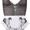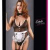 Body wykonane z powernetu z koronkowym zdobieniem. Z regulowanymi ramiączkami oraz regulowanymi i odpinanymi szelkami. Otwarte w kroku. W komplecie kołnierzyk z muszką i zapięciem na rzep oraz fartuszek do zawiązania.
