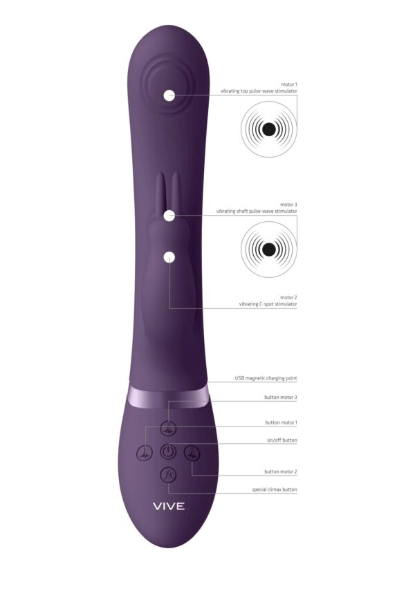 Wyjątkowa konstrukcja wibratora króliczka VIVE045 Dual Pulse Wave wyróżnia go pod każdym względem spośród innych zabawek erotycznych.Ten przepięknie zaprojektowany wibrator jest napędzany trzema niezależnie sterowanymi silniczkami F1 nowej generacji o 10 prędkościach/funkcjach.Pierwszy zapewnia stymulację punktu G dzięki technologii Pulse Wave, kolejny napędza króliczka do zewnętrznej stymulacji łechtaczki a wyjątkowa i niepowtarzalna funkcja wewnętrznej stymulacji łechtaczki możliwa jest dzięki ostatniemu z nich.To naprawdę wszystko zmienia. Ponad 1000 różnych kombinacji pozwoli tej zabawce zabrać Cię w miejsca, o których nawet nie śniłaś. A gdy już będziesz blisko, za jednym dotknięciem przycisku z funkcją szczytowania natychmiastowo nastawisz wszystkie silniczki na pełną moc i prędkość.Wibrator wykonany w całości z medycznego silikonu jest ładowany za pomocą magnetycznego USB i może się pochwalić akumulatorem, który zapewni ci 60 minut zabawy. Jest też całkowicie wodoszczelny (IPX7), co oznacza, że jego towarzystwem możesz cieszyć się wszędzie. Wszystkie wibratory VIVE mają roczną gwarancje.