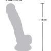 Długość całkowita 18 cm, długość wkładki 12,5 cm, średnica 2,6-3,5 cm. Silikon (płynny silikon).