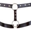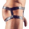 Matowy pas biodrowy z elastyczną taśmą na udach. Z bocznymi D-ringami i cock ringiem na pasku. Rozmiar regulowany za pomocą zatrzasków.