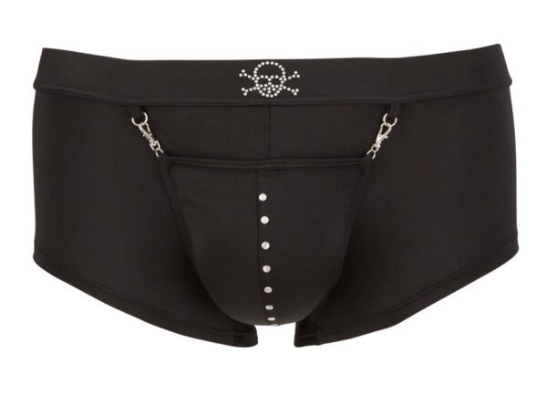 Podkreślające figurę spodnie pirackie z kieszenią i karabińczykiem. Z funkcją pęcznienia dla imponującego wybrzuszenia z przodu i autentyczną nitowaną czaszką w pasie. Idealne na dzikie przygody i gorące odgrywanie ról.