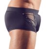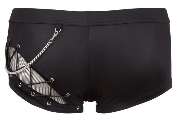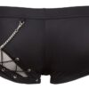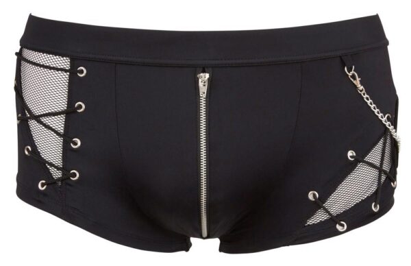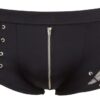 Spodnie z umiejętnego połączenia materiału kryjącego i przezroczystego (fishnet) z odpinanym ozdobnym łańcuszkiem i zamkiem błyskawicznym z przodu. Czarny. Wysoka elastyczność.
