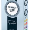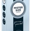 Przezroczyste, cienkie prezerwatywy Mister Size (47 mm) wykonane z lateksu kauczuku naturalnego z warstwą lubrykantu i zbiorniczkiem. Wegańskie.