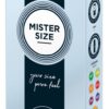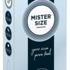 Przezroczyste, cienkie prezerwatywy Mister Size (53 mm) wykonane z lateksu kauczuku naturalnego z warstwą lubrykantu i zbiorniczkiem. Wegańskie.