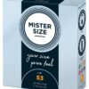 Przezroczyste, cienkie prezerwatywy Mister Size (53 mm) wykonane z lateksu kauczuku naturalnego z warstwą lubrykantu i zbiorniczkiem. Wegańskie.