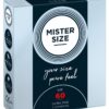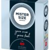 Przezroczyste, cienkie prezerwatywy Mister Size (60 mm) wykonane z lateksu kauczuku naturalnego z warstwą lubrykantu i zbiorniczkiem. Wegańskie.