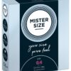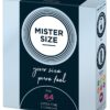 Przezroczyste, cienkie prezerwatywy Mister Size (64 mm) wykonane z lateksu kauczuku naturalnego z warstwą lubrykantu i zbiorniczkiem. Wegańskie.