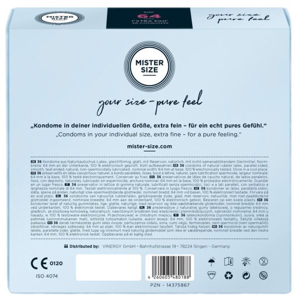 Przezroczyste, cienkie prezerwatywy Mister Size (64 mm) wykonane z lateksu kauczuku naturalnego z warstwą lubrykantu i zbiorniczkiem. Wegańskie.